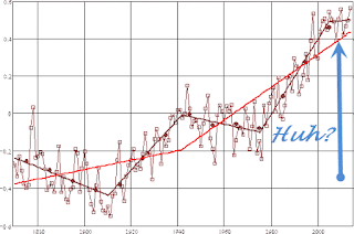 Here is the chart that he was talking about, with his "low warming rate". I've added and arrow and a "Huh?" for obvious reasons: