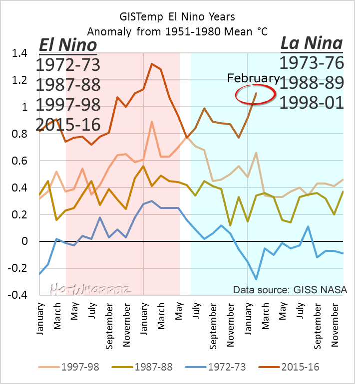 Figure 3 | Global mean surface temperature for strong or moderate/strong El Nino years that were followed by a La Nina. Also includes the 2015/16 El Nino for comparison. Data source: GISS NASA |